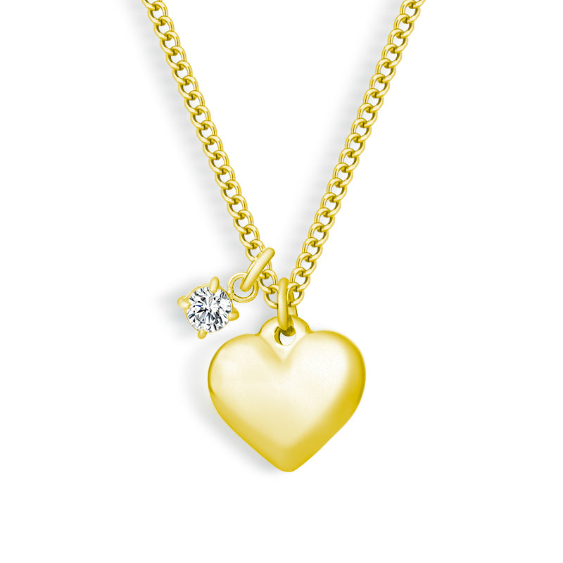This Mon Cheri Necklace adds an adorable touch to any outfit with its heart pendant and prong set stone pendant. The delicate curb chain adds charm while the pendants bring a pop of cuteness. A perfect accessory for any occasion.
